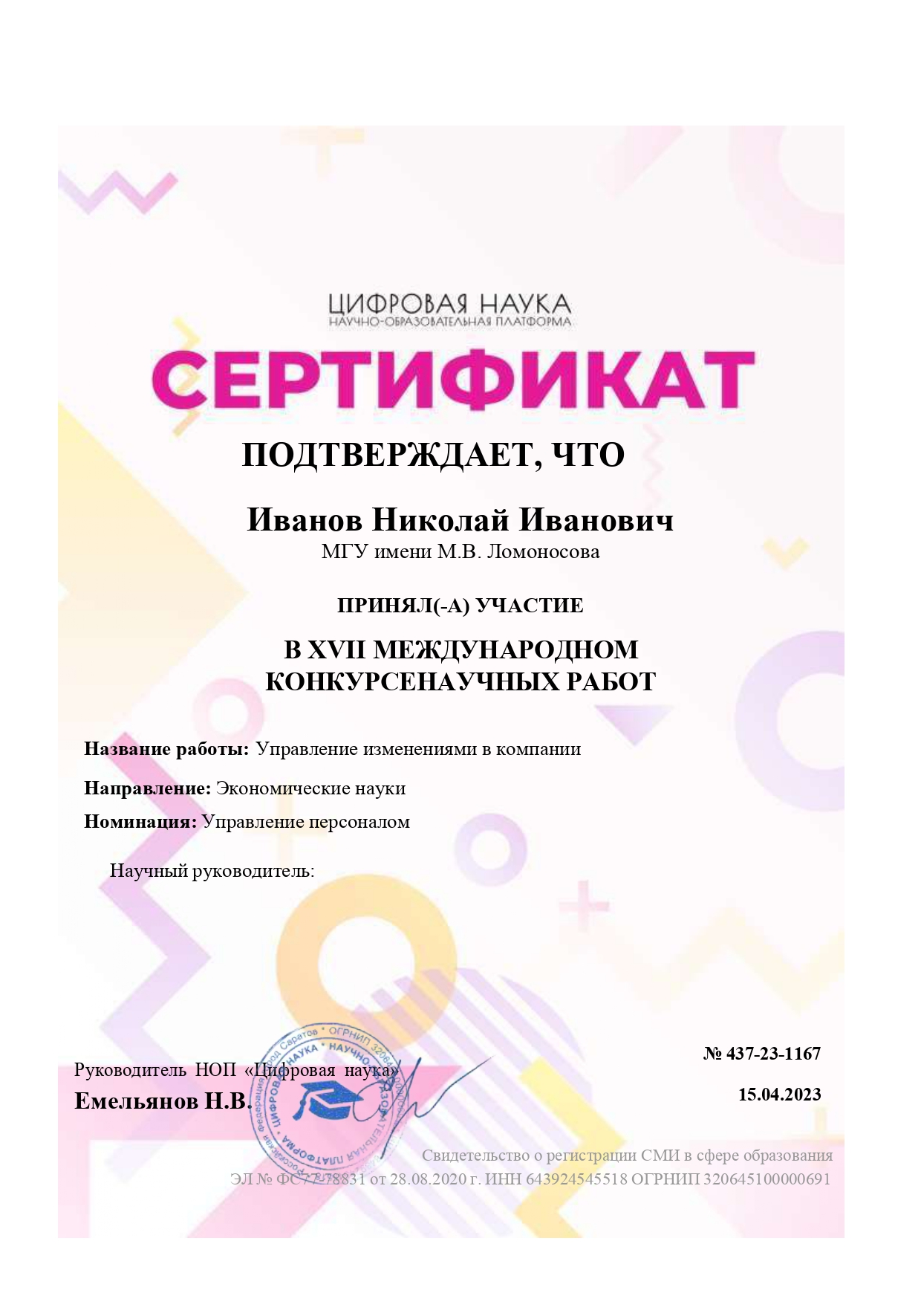 Научно-образовательная платформа «Цифровая наука» объявляет о проведении Всероссийского конкурса творческих работ «Защитник глазами поколений» в номинациях:
